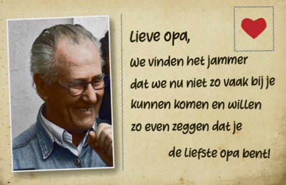 U kunt een tekst voor een kaartje insturen voor bijvoorbeeld uw vader, moeder, opa of oma. Veel mensen voelen zich nu alleen en kunnen een oppeppertje wel gebruiken. Laat weten dat er aan ze gedacht wordt!