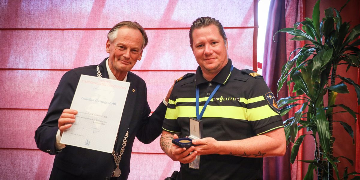 MEDEMBLIK - Donderdag 9 juni heeft burgemeester Frank Streng in het gemeentehuis, de Carnegie onderscheiding uitgereikt aan Nick Schuiling uit Zwaagdijk-Oost. Nick redde op 12 februari 2021 een vrouw uit het ijskoude water in Amsterdam.